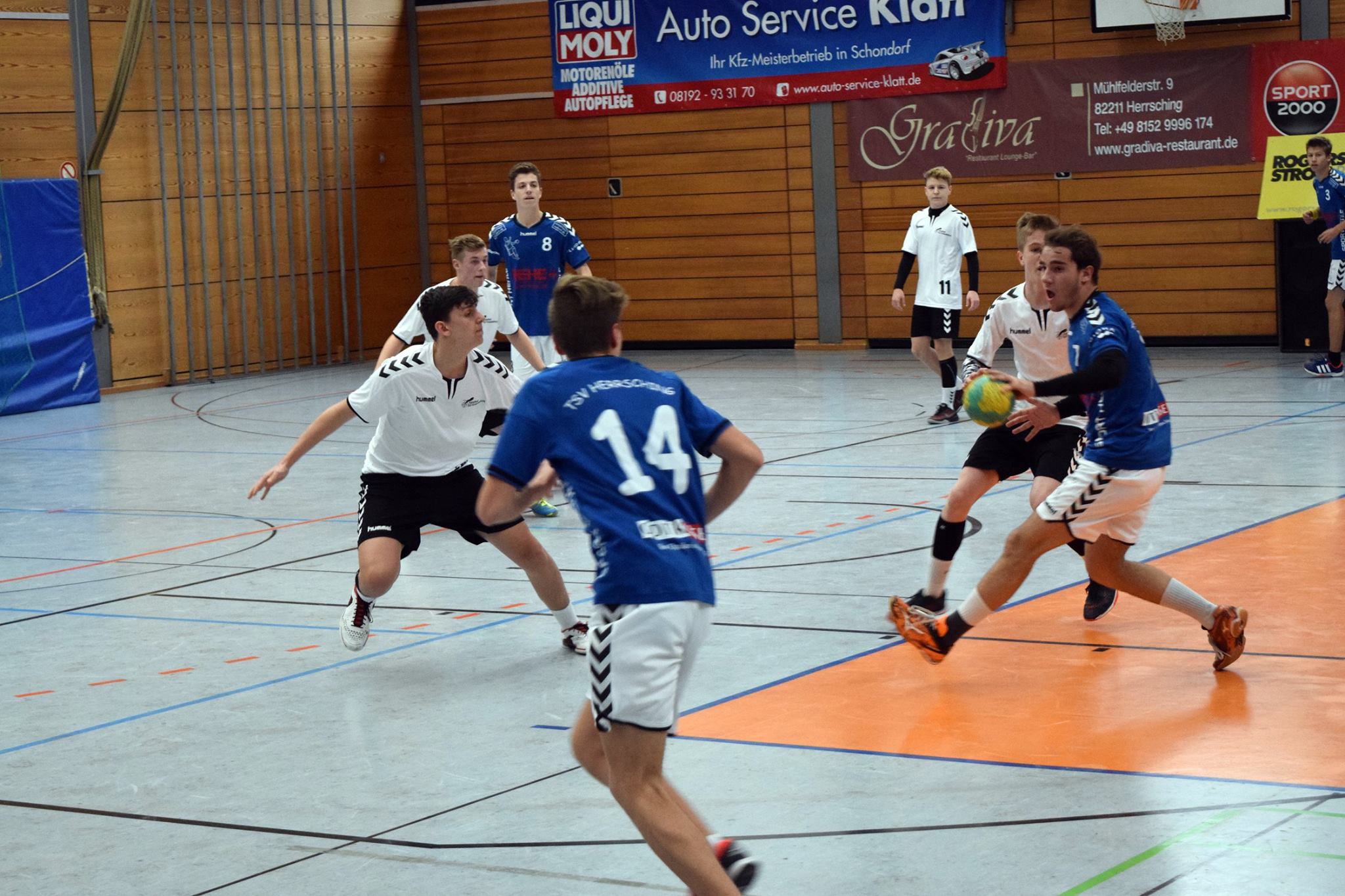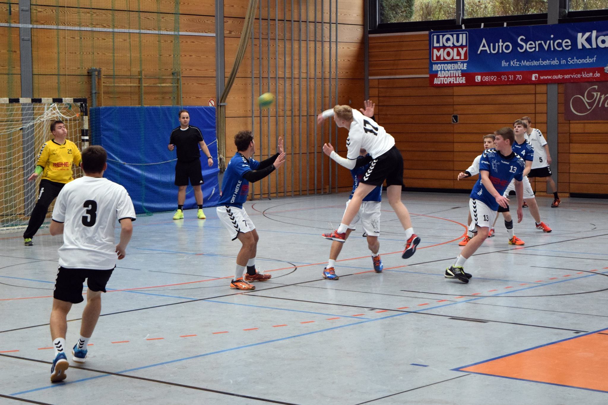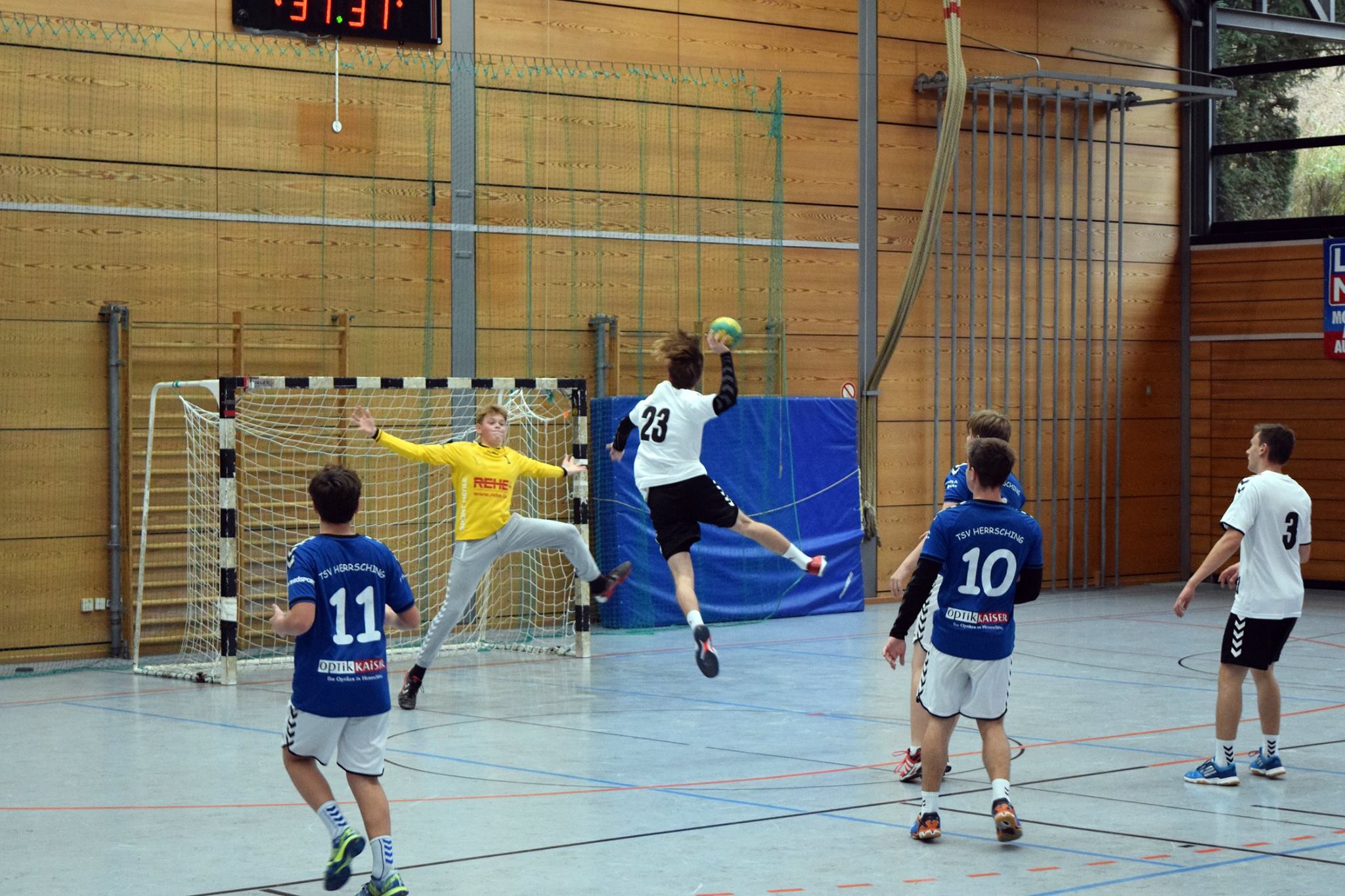 In Spielminute 13 führten allerdings die Gegner mit 6:9. Die gut stehende Abwehr wurde anfangs immer mal wieder von Herrsching überwunden, sei es durch knappe Schiedsrichterentscheidungen oder durch Pässe bzw. Würfe, die doch noch zum Erfolg führten. Die gegnerischen Fans in der gut besuchten Herrschinger Halle witterten sofort die Chance, heute den Tabellenführer schlagen zu können und machten laut Stimmung für ihre Mannschaft. Doch diese unüberhörbare Kulisse spornte das FFB-Team aber eher richtig an. Durch eine Auszeit konnte die Konzentration wieder auf die entscheidenden finalen Aktionen gelenkt werden, die Hektik verschwand und die Jungs hatten keine Lust, sich hier unter Wert zu verkaufen. Sie drehten innerhalb der nächsten zehn Spielminuten das Spiel zu ihren Gunsten. Mit einem knappen 13:14 gingen sie in die Pause.