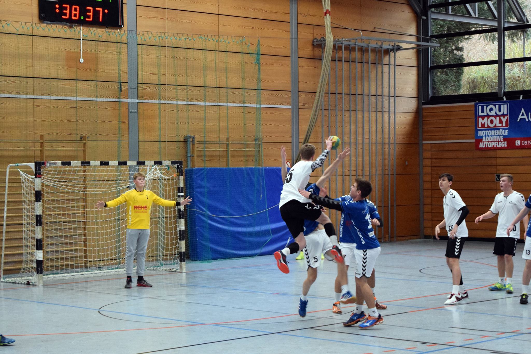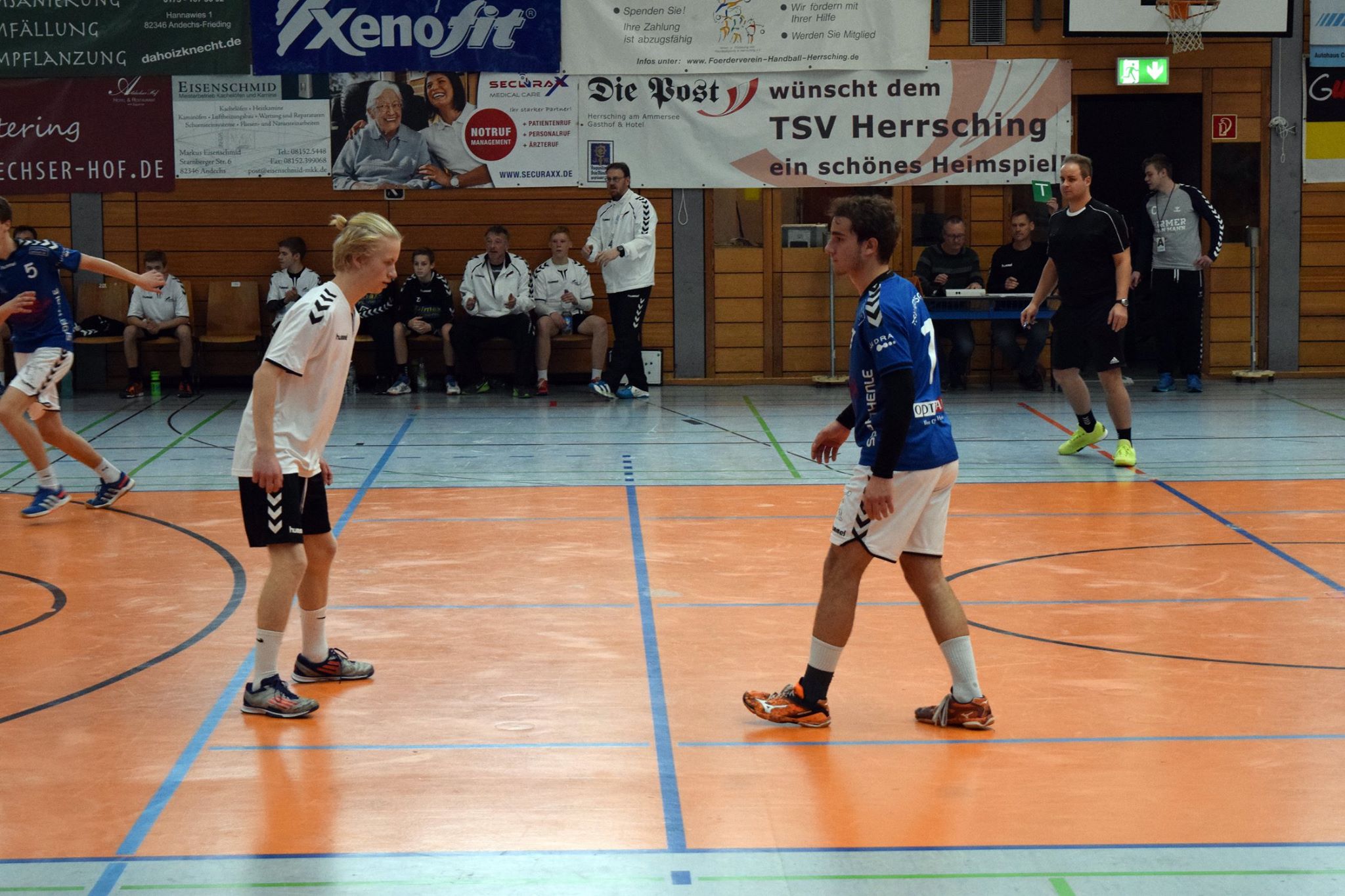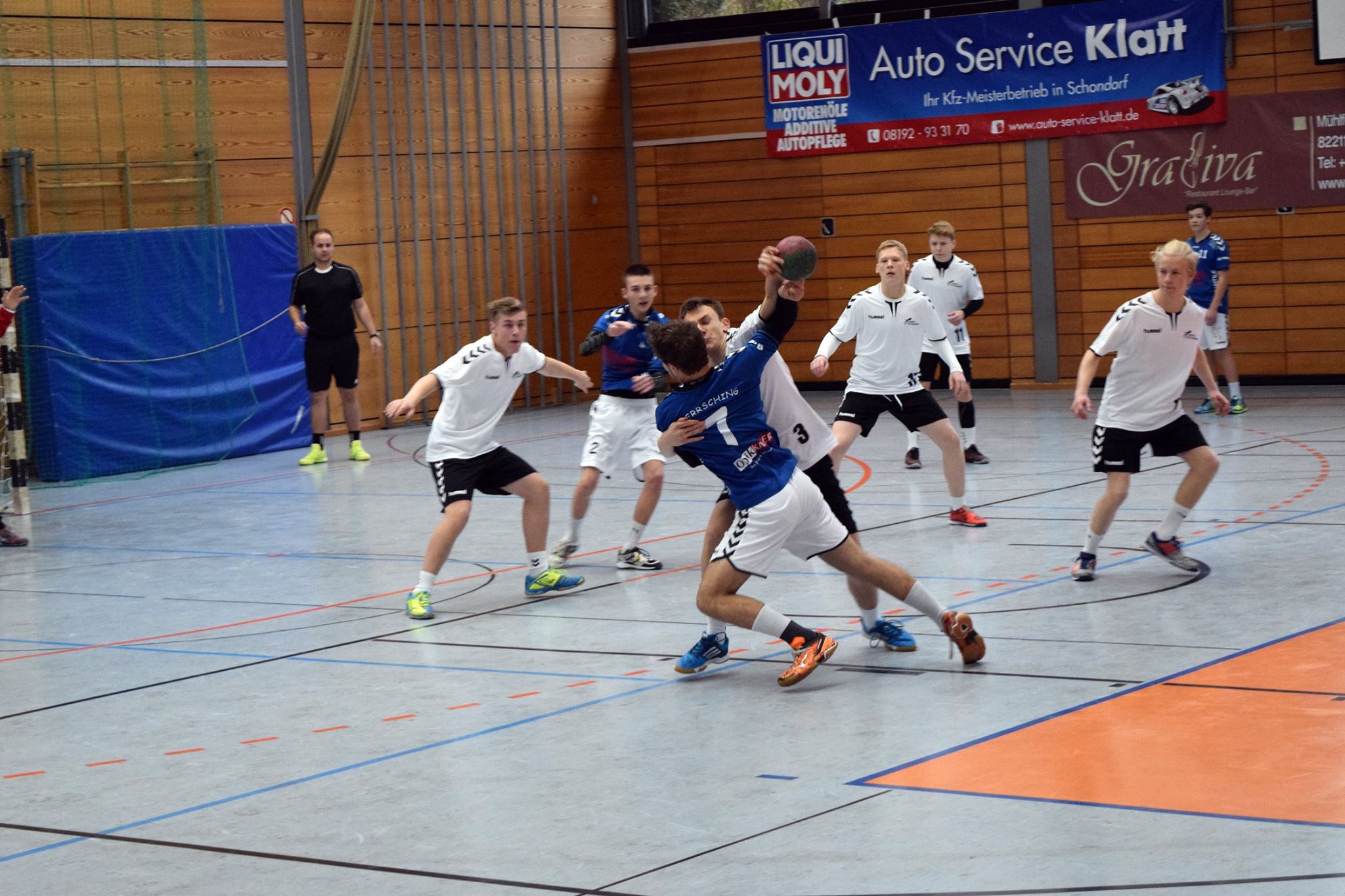 In Spielminute 13 führten allerdings die Gegner mit 6:9. Die gut stehende Abwehr wurde anfangs immer mal wieder von Herrsching überwunden, sei es durch knappe Schiedsrichterentscheidungen oder durch Pässe bzw. Würfe, die doch noch zum Erfolg führten. Die gegnerischen Fans in der gut besuchten Herrschinger Halle witterten sofort die Chance, heute den Tabellenführer schlagen zu können und machten laut Stimmung für ihre Mannschaft. Doch diese unüberhörbare Kulisse spornte das FFB-Team aber eher richtig an. Durch eine Auszeit konnte die Konzentration wieder auf die entscheidenden finalen Aktionen gelenkt werden, die Hektik verschwand und die Jungs hatten keine Lust, sich hier unter Wert zu verkaufen. Sie drehten innerhalb der nächsten zehn Spielminuten das Spiel zu ihren Gunsten. Mit einem knappen 13:14 gingen sie in die Pause.